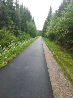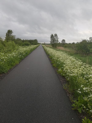 Der Radweg ist wirklich endlos. So weit das Auge reicht keine Kurve und mitten durch den Wald gebaut. Echt mitten durch die Natur. Hab heute eine Ricke mit ihren 2 Kitzen gesehen. Einen Fasan, 5 Kraniche und mindestens 100 Kühe und Pferde auf den Weiden.