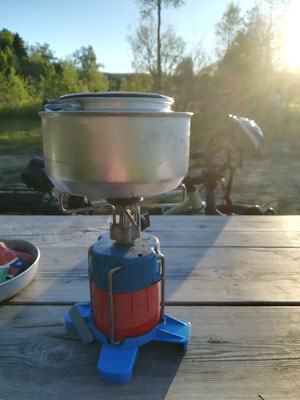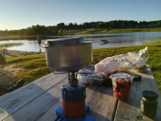 Heute ging es wieder 158km weit. Es wird im freien an einem See gecampt. Die Mücken sind echt übel hier. Musste mein Essen: Nudeln mit Pesto schon ins Zelt verlegen.