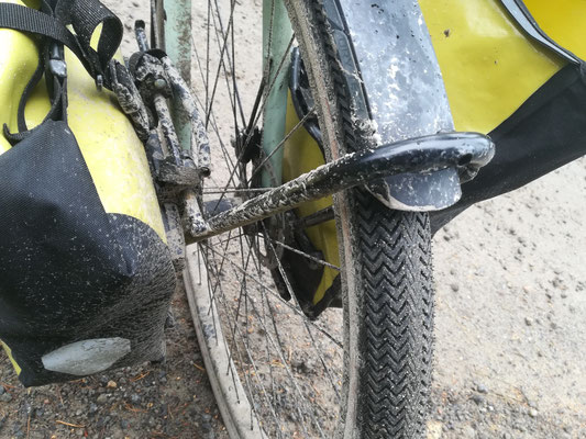 So hab ich mich dann durch den Tag gequält, muss ich sagen. Über viel Schotterwege und im Regen. Da hat der Spaß echt ein Loch. Die Bremse und Gangschaltung hat auch noch geschliffen vor lauter Dreck und Sand.