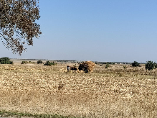 Und schwupps tatsächlich, 5 min später ein Pferdefuhrwerk mitten auf so einem riesen Feld. Die Leute haben nach Maiskolben gesucht, die der Mähdrescher vergessen hat.