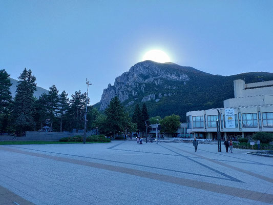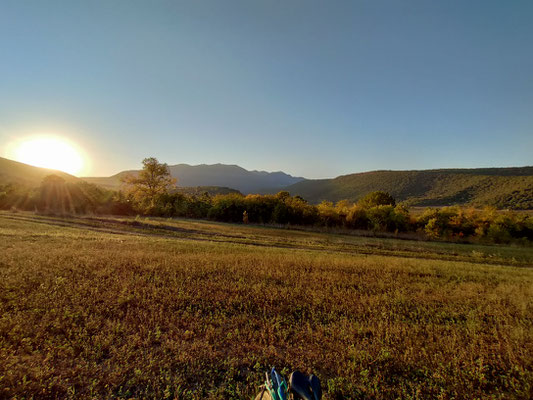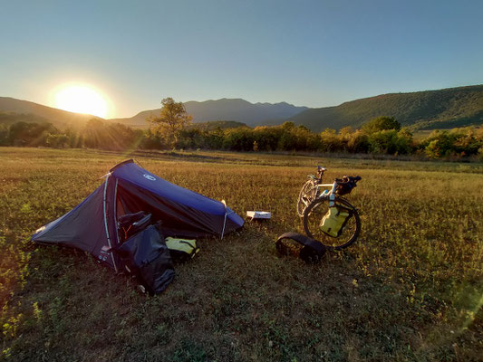Letztendlich hab ich nach 151km die Reißleine gezogen. Ich hab ne kleine Wiese neben einer kaum befahrenen Straße gefunden und dort mein Zelt aufgestellt und danach bei schönen Sonnenuntergang zwischen den Bergen genüsslich meine Pizzen verschlungen. Was für ein Panorama! In den Alpen könnte es nicht besser sein.