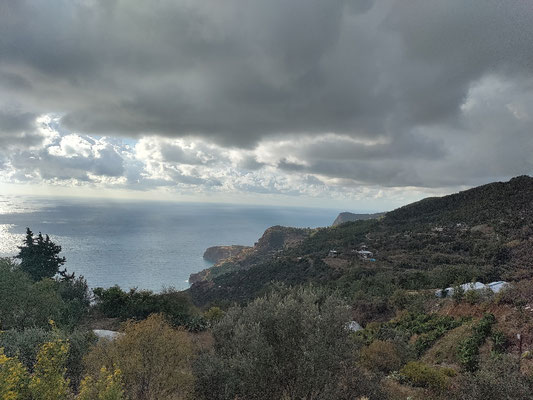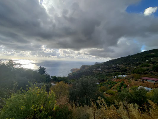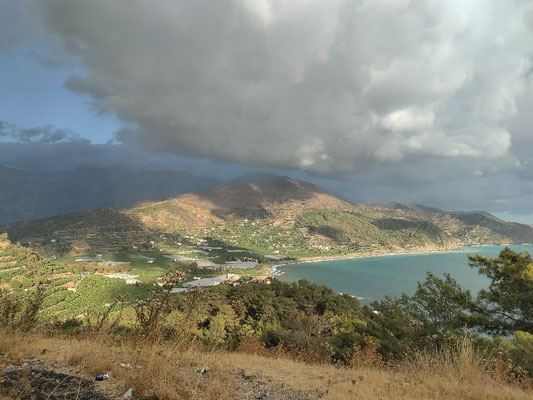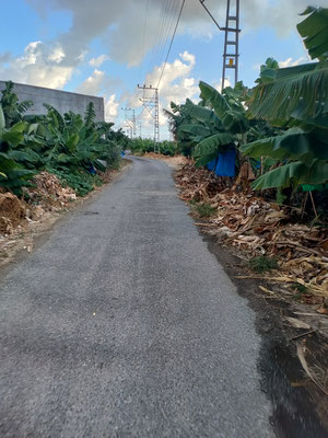 Ein wunderbarer Tag geht am Strand zu Ende! Ich hab mir auf dieser Tour immer mal vorgestellt, am Strand zu übernachten und heute ist es endlich soweit. Mega cool! Ich hab einen Platz mutterseelenallein gefunden. Ein paar Häuser stehen in der Umgebung, in einem Tal mit lauter Bananenbäumen. Ja ich bin jetzt mittlerweile soweit gefahren. Jetzt wachsen auch schon Bananen. Oliven und Baumwolle ist mittlerweile schon Alltag geworden.