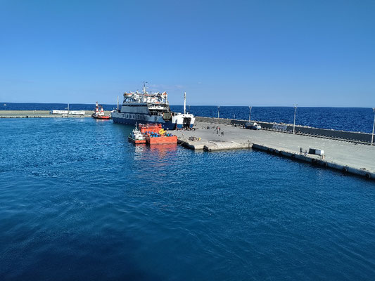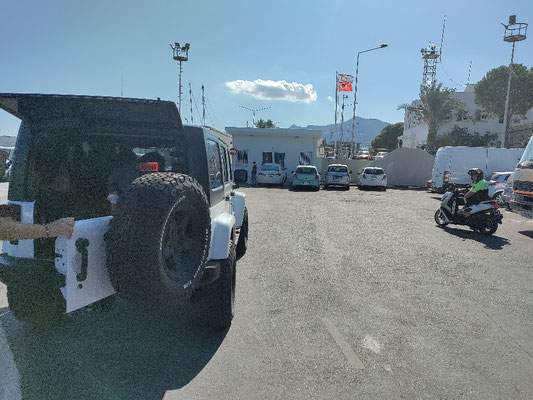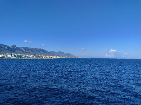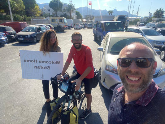 Um 3:30 Uhr, also mit 4 Std. Verspätung, ging es dann los. In der ganzen Zeit gab es keine Durchsage oder Personal, dass man fragen hätte können. Alle haben es einfach hingenommen und versucht zu schlafen. In Deutschland undenkbar. So schipperten wir im dunkeln Richtung Zypern. 6 Std. dauert die Überfahrt mit dieser langsamen Fähre. Man kann es auch in 2,5 Std. schaffen mit einer anderen. Irgendwann hab ich meine Kopfhörer ausgepackt und Musik gehört, das erste mal auf dieser ganzen Reise, aber das Schnarchen und scheppern, hat mich ganz schön wütend gemacht, weil ich einfach nur schlafen wollte. Insgesamt sind es dann so 4 Std. Schlaf geworden und bei Sonnenaufgang konnte ich schon Zypern am Horizont ausmachen. die Nacht hat mich aber ganz schön geschlaucht. 1 Std. vor Ankunft, war dann wirklich Land in Sicht! Als wir dem Hafen von Girne immer näher kamen,wurde es auch immer emotionaler. Ich stehe hier auf einem Boot und fahre in den Hafen ein. Bei tollen blauen Himmel und einer Mega Sicht. Hier ist wirklich eine Last von mir abgefallen und ich hatte Freudentränen in den Augen! Meistens passiert mir das in Momenten in denen ich für mich sein kann. Sobald es Publikum gibt, passiert das nicht mehr. Also nach dem Anlegen von der Fähre, wieder an allen LKW's vorbei. Und als ich Richtung Ausgang gefahren bin. Hab ich auf einmal meinen Namen gehört. Ich hab im ersten Moment Jennet total übersehen, weil ich nicht gerechnet habe, dass sie und Salih hier schon auf mich warten. Mega cool! Endlich mal wieder jemanden zu treffen, den man kennt. Ich musste aber vorher noch nach Zypern einreisen, mit Stempel und so weiter. Das war wegen dem ganzen Corona Zeug bissl kompliziert und ich hab auch das System nicht verstanden, hat aber am Ende geklappt und ich bin meine ersten Meter auf zypriotischen Boden gerollt! Zur Feier des Tages hat mich gleich ein kleiner Konvoi in meine Wohnung begleitet. Jennet und Salih hatten sogar einen Photograph mit an Bord, der aus dem Kofferraum Bilder gemacht hat als ich in die Wohnung gefahren bin. Zusätzlich hat uns noch die Straßenpolizei mit einem Motorrad begleitet und wir sind dann, Motorrad mit Blaulicht dann Salih und Jennet in einem Jeep mit Photograph und ich mit meinem kleinen Fahrrad in Richtung Alsancak gefahren. Ein bisschen, wie wenn hoher Staatsbesuch kommt. ;) Der Polizist hat jeden Kreisverkehr für mich gesperrt, damit ich nicht warten musste. Total cool. So bin ich eigentlich die letzten 13km dieser Tour ins Ziel geflogen, ich hab alles gegeben, um endlich anzukommen. Vor allem muss man sich auf so einer kurzen Strecke nicht schonen und ich wollte ja dem Konvoi keine Schande machen ;).