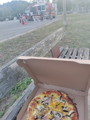 Das gute ist, direkt vor meinem Zelt und vor dem Gebüsch war ein Pizzawagen, wie bei uns vom Heustadl und ich hab mir natürlich zur Feier des Tages, um wieder Energie zu bekommen eine schöne Pizza mit meinem gebrochenen französisch bestellt. Vielleicht hätte ich in der Schule doch besser aufpassen sollen. Aber es hat mir französisch, Englisch Mischmasch funktioniert.