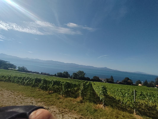 Nun zu meinem Tag. Zu Beginn ging es direkt ein bisschen oberhalb des Genfer See's entlang. Ein traumhaftes Panorama. Unten der See dahinter steigt die Sonne langsam auf und man fährt durch die Weinberge, einfach Wahnsinn. Je näher ich an Genf kam desto mehr Villen gab es. Die vorderste Reihe zum See ist fest in der Hand eines zahlungskräftigen Publikums. Leider hat man das Ufer des Sees so gut wie nie gesehen. Hohe Hecken und Bäume dazu noch Mauern und Tore machten es fast unmöglich mal einen Blick in den Garten eines Anwesens zu erhalten.